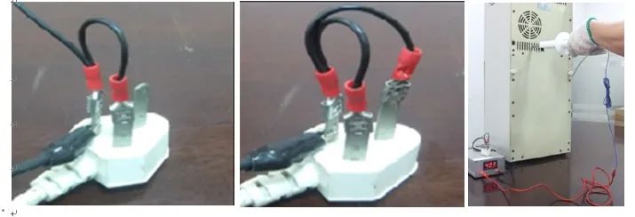 第2步:将电源指示器的另一条线与测试产品的电源地线相接,开启电源指示器的电源开关,这时显示为42V,把试验指或试验探棒的金属部位插入被试的部位,然后按标准相关要求进行测试(如下图所示),蜂呜器发出响声即为触电提示。按下“复位”键后可重新进行试验。