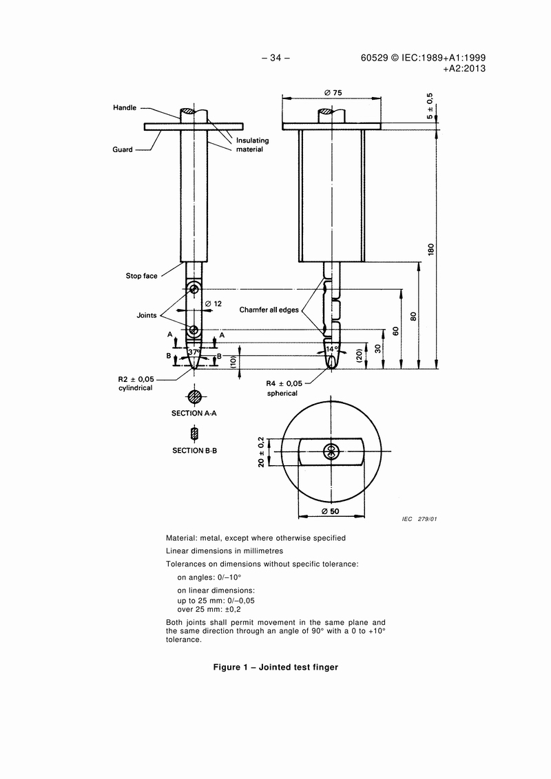 Product description: The Jointed test finger is a precision test probe made according to Figure 1 (Fig. 1) of the IEC 60529 (IP2X Test Probe) with 10N Thrust and is used to simulate a human finger. It is also used by the standards of IEC 61032.
